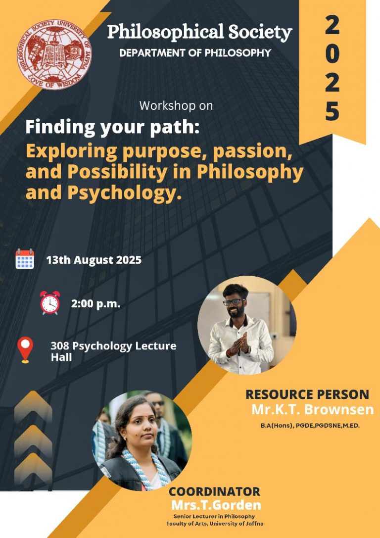The Philosophical Society of the Department of Philosophy, Faculty of Arts, University of Jaffna, successfully organized a workshop titled “Finding Your Path: Exploring Purpose, Passion, and Possibility in Philosophy and Psychology” on the 13th of August 2025 at 2.00 p.m. The event was held at the Psychology Lecture Hall (Room 308).